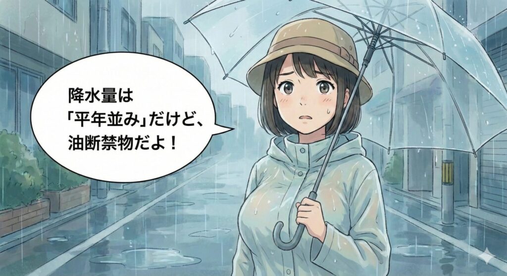 「平年並みなら安心?」と思いきや、ここには注意点があります。あくまで「夏の総雨量」が平年並みというだけで、梅雨の時期の大雨リスクが低いわけではありません。